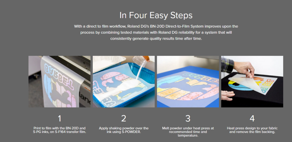 With a direct to film workflow, Roland DG’s BN-20D Direct-to-Film System improves upon the process by combining tested materials with Roland DG reliability for a system that will consistently generate quality results time after time.